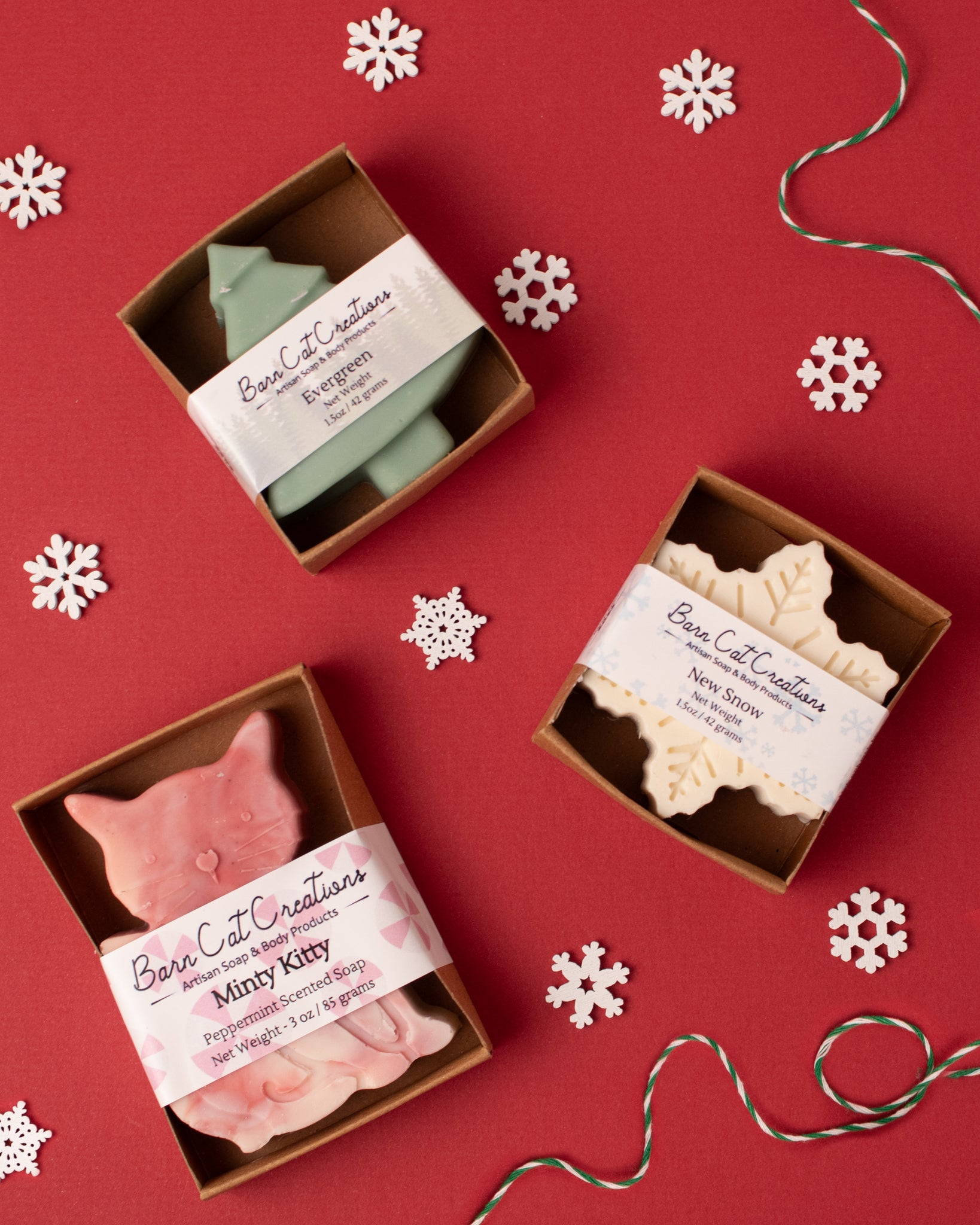 Holiday kitty soap gets an update this year! Welcome Minty Kitty, scented with peppermint essential oil and colored in a red & white swirl.
